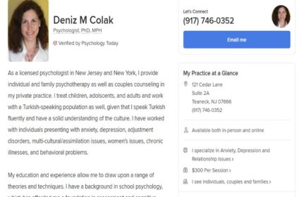 Save Added By Sabit Now Open Deniz Colak 121 Cedar Ln Ste 2A Teaneck, New Jersey As a licensed psychologist in New Jersey and New ... Facilities: